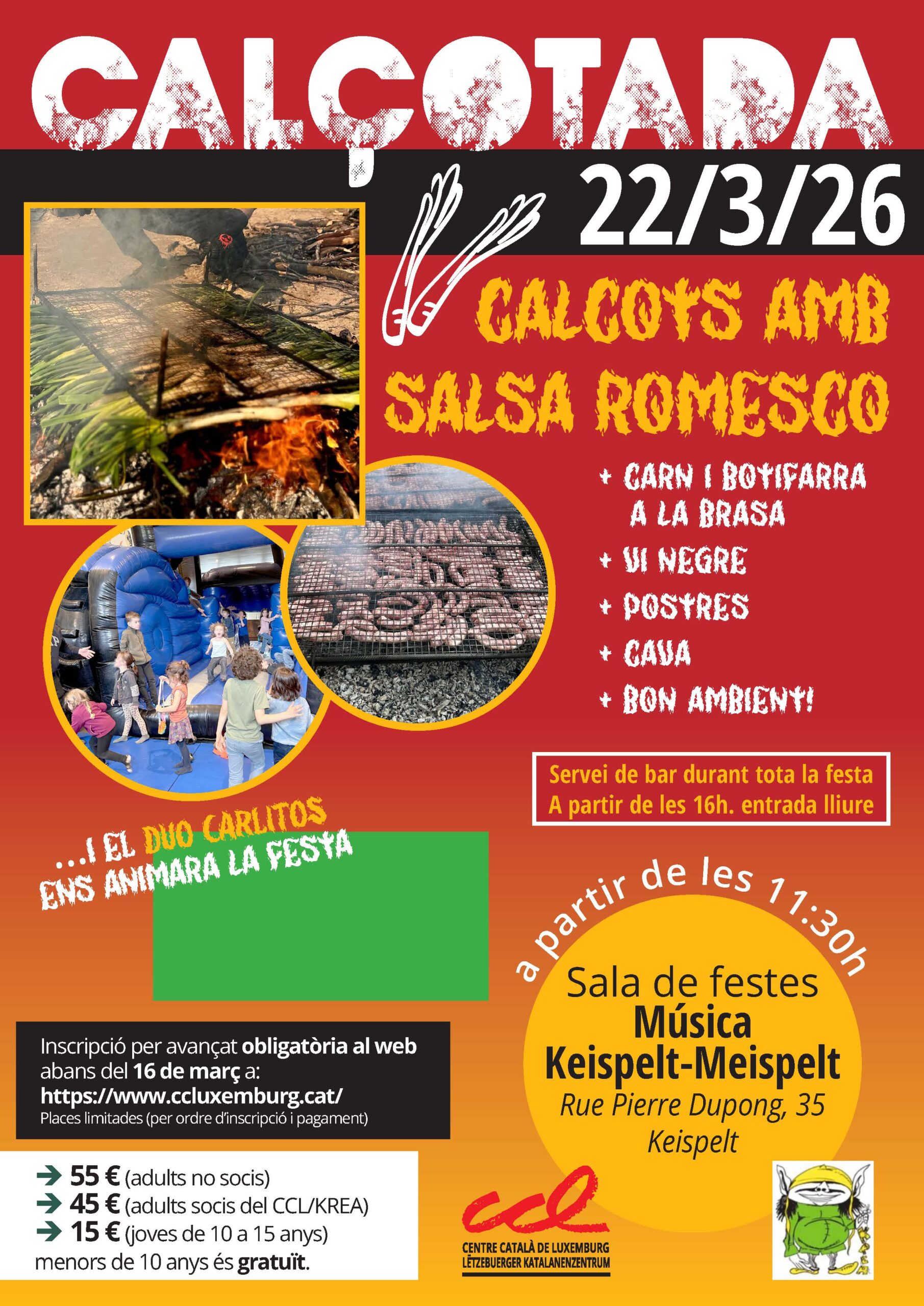 Ens ho demanàveu i ja és aquí: diumenge 22 de març celebrarem la calçotada del 2026. Ens trobarem a la sala de festes de la Fanfare Keispelt-Meispelt, a la Rue Pierre Dupong número 35, de Keispelt.